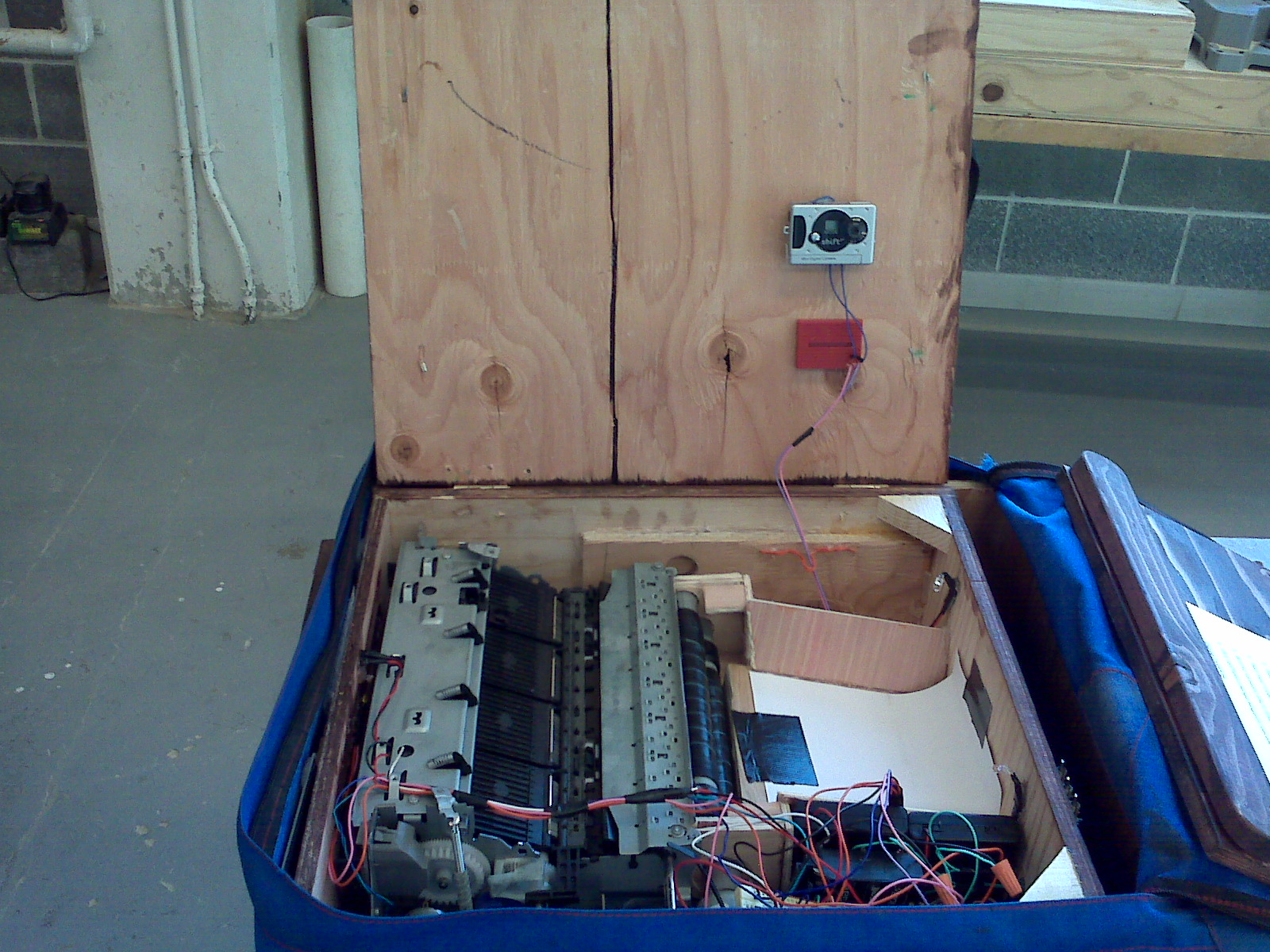 Initially, Project 3 was going to be an entirely new project and design. However, the teachers thought it would be beneficial to make project three a continuation of project two. This proved to be a wise decision, because or piece was a good idea but needed work. After the critiques of our project, we decided to make some much needed changes and updates. These update and changes included a better constructed piece and an easier drawing pad for those interacting with the piece. Also, we included a hacked digital camera and lighting system inside the piece so that the art work inside could be documented and shared through a blog we created for it. i also wrote a new program for the arduino that is cleaner and more reliable as well as more energy efficient. Since we had more components with the lighting system and camera, i better arranged cod was necessary. Here are pictures of the construction of the revamped project three as well as the final piece.